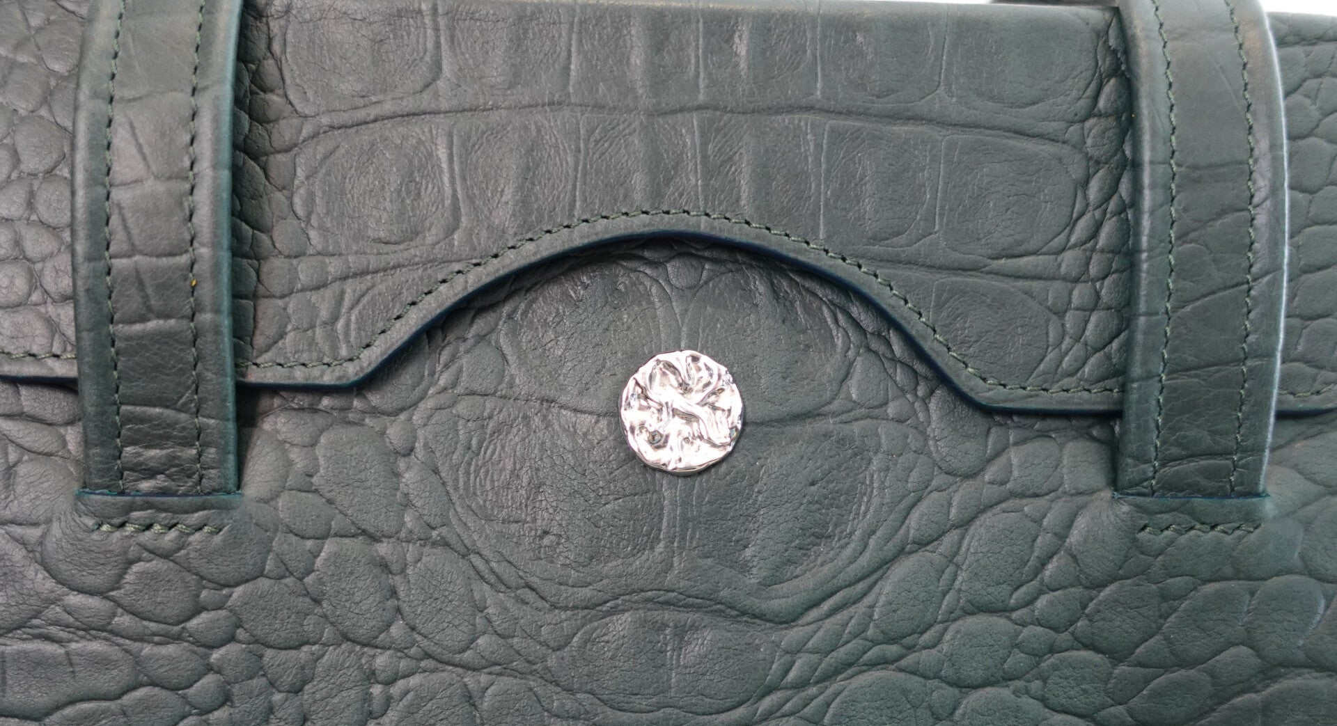 Groene ANTtas in rundsleder en voering in wit varkensleer. Verwerkt met stof uit de collectie van Valentine Tinchant. Afmeting: 20x19x6.